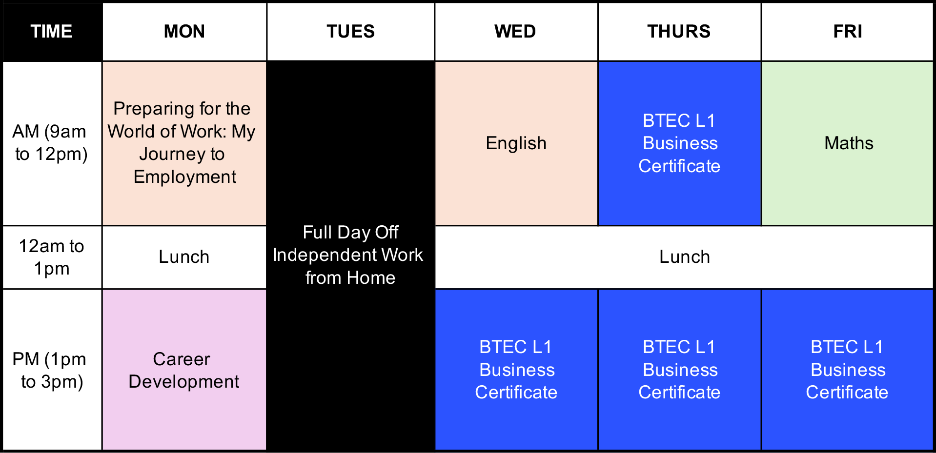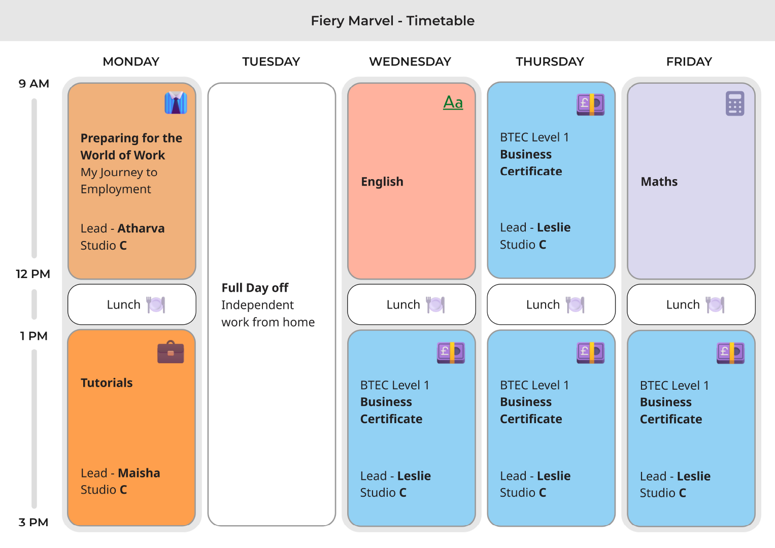 Our learners work in small, supportive teams that reflect their interests, strengths and areas of development. Each team follows a structured weekly timetable that blends creative studio time, skills development, project work and personal support.