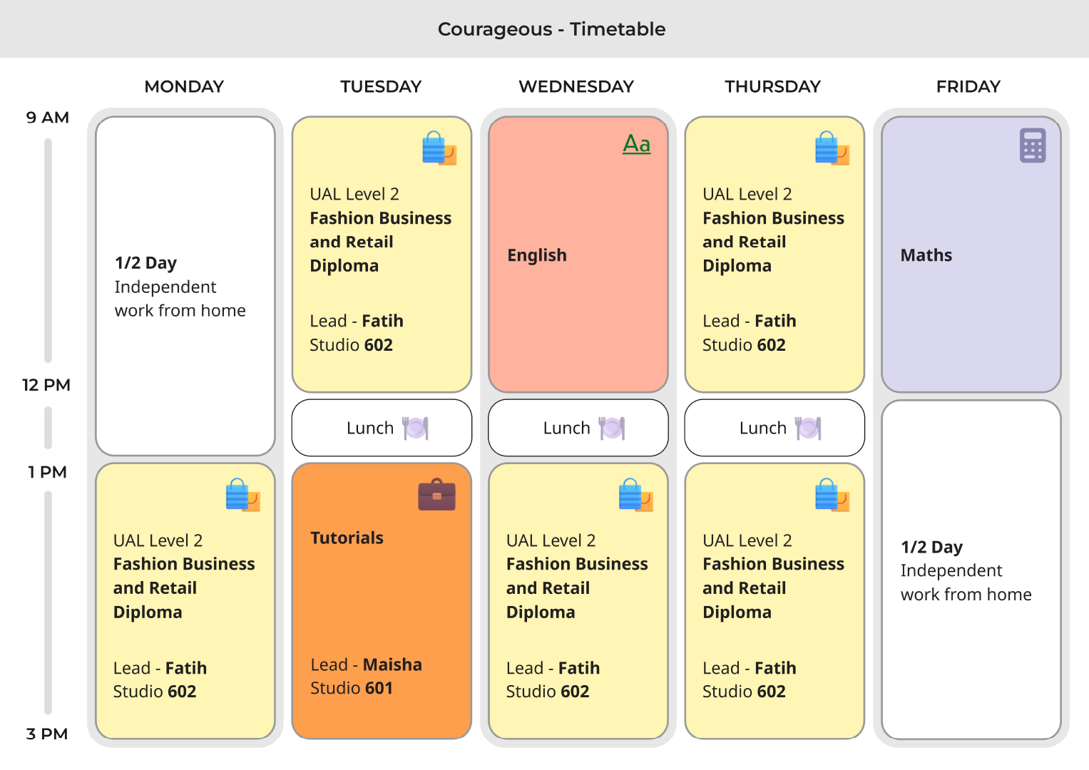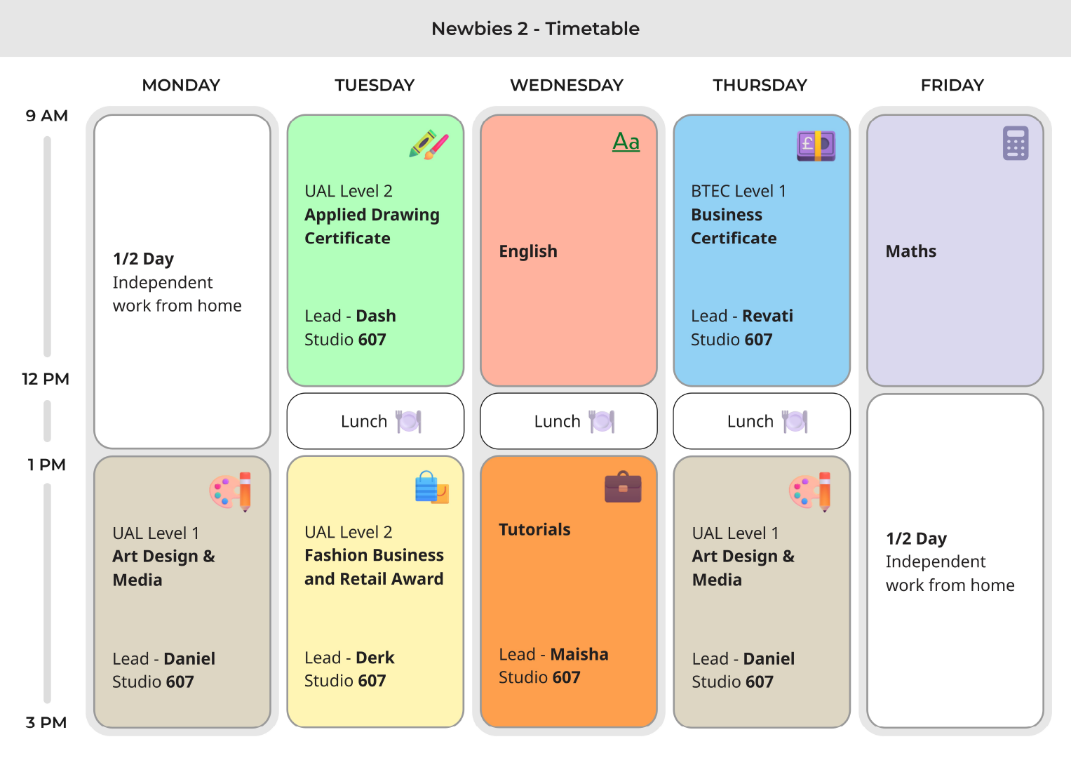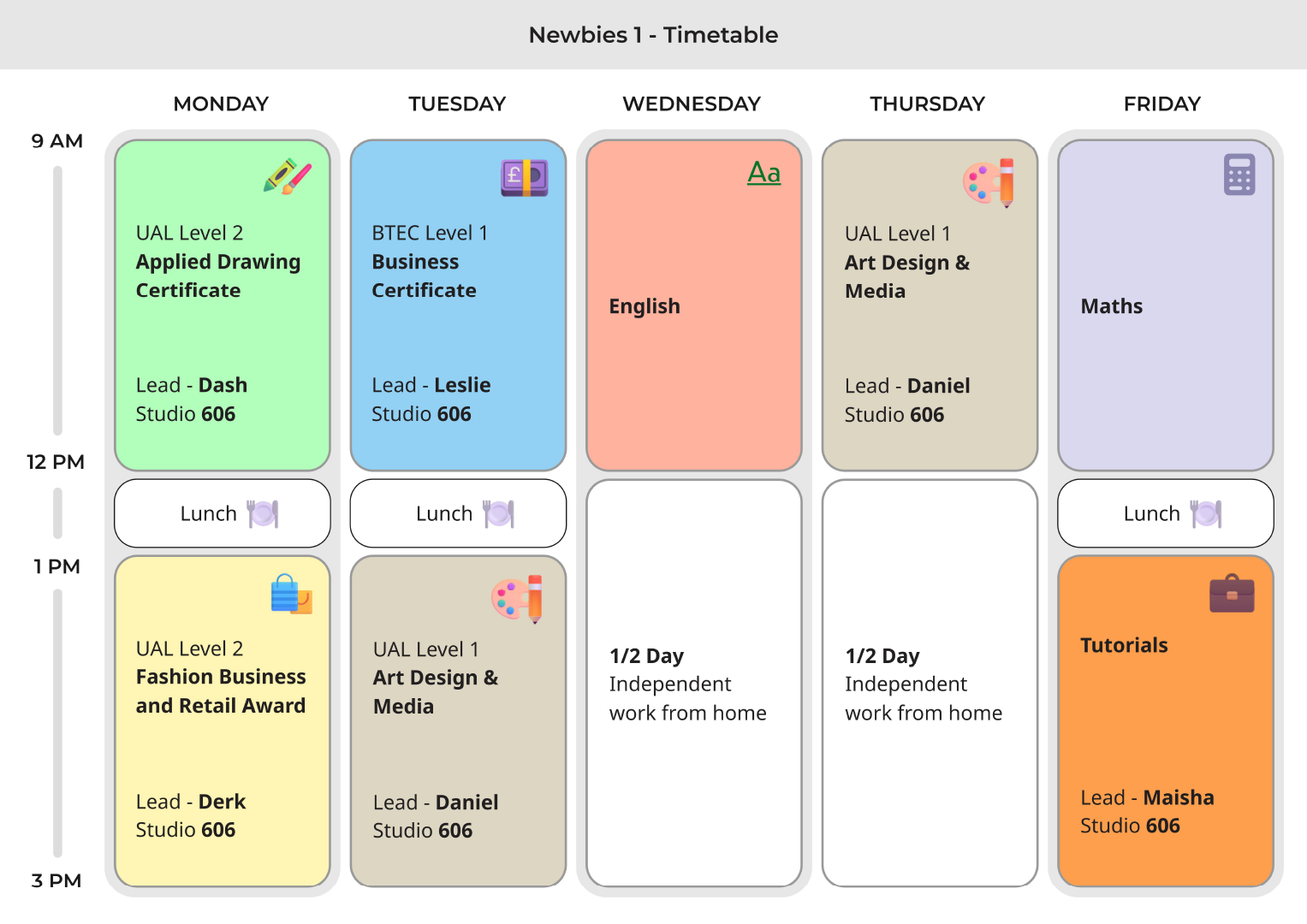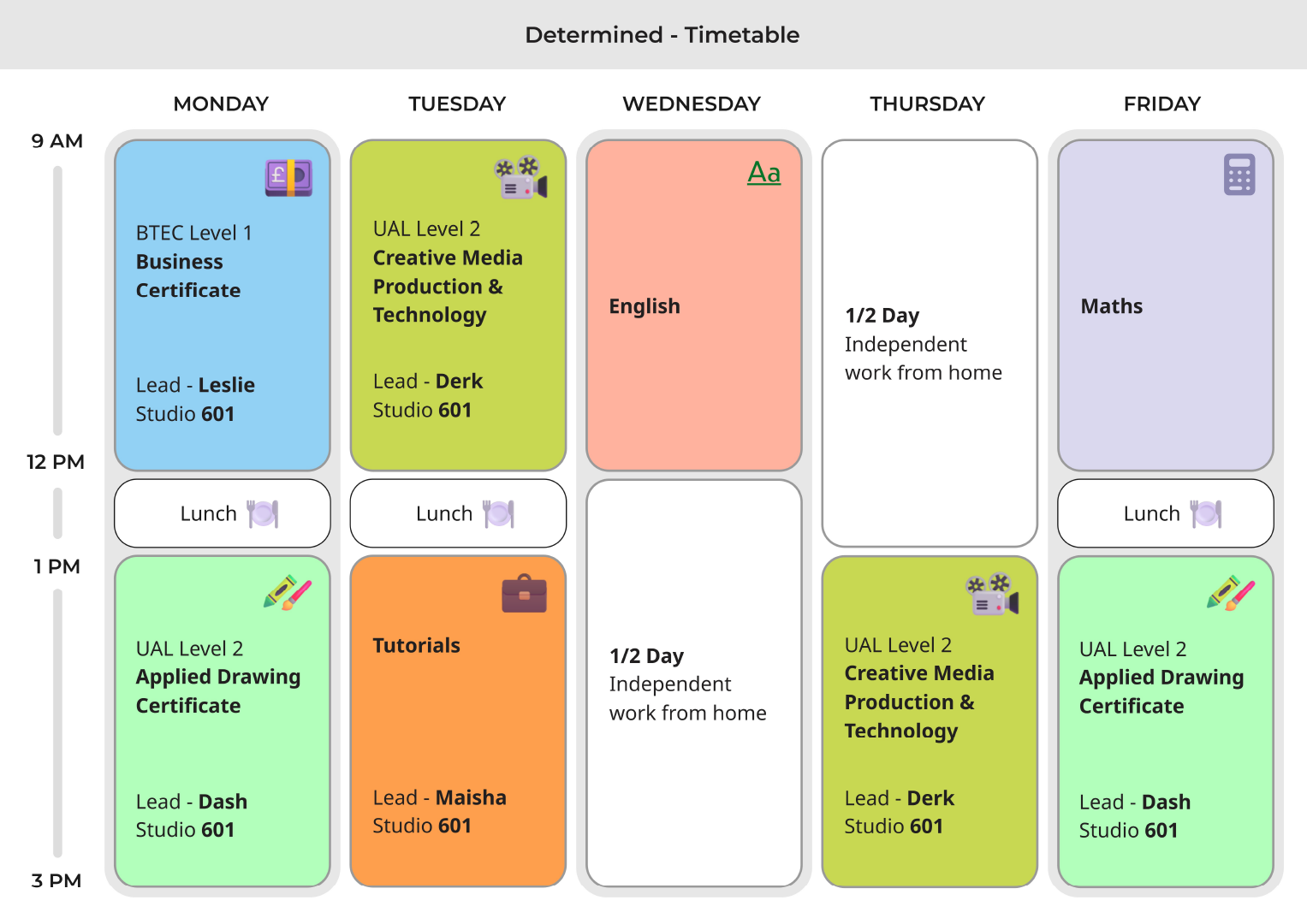 Rather than a one size fits all schedule, timetables are shaped to support focus, collaboration and progression. This team based approach helps learners build confidence, develop communication skills and experience how creative work happens in real world environments.